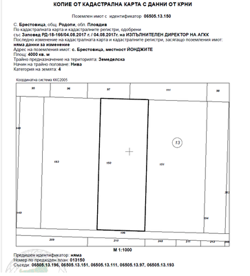 ИД 202382504008831/6 ид. ч. (една шеста идеална част) от поземленимот с идентификатор 06505.13.150 (нула, шест, пет, нула, пет, точка, едно, три, точка, едно, пет, нула), по кадастралната карта и кадастралните регистри на с. Брестовица, общ. Родопи, обл. Пловдив, одобрени със Заповед РД-18-166/04.08.2017 г. на ИЗПЪЛНИТЕЛЕН ДИРЕКТОР НА АГКК, с адрес на поземления имот: с. Брестовица, местност ЙОНДЖИТЕ, с площ: 4000 кв. м. (четири хиляди квадратни метра), с трайно предназначение на територията: Земеделска и начин на трайно ползване: Нива, с категория на земята: 4 (четвърта), с номер по предходен план: 013150 и съседи: 06505.13.196, 06505.13.151, 06505.13.111, 06505.13.97, 06505.13.193. Началната цена, от която ще започне публичната продан на гореописания имот е в размер на 1280,00€ (хиляда двеста и осемдесет евро), съставляваща 80 % от стойността на имота, съгласно чл. 485 от ГПК.
