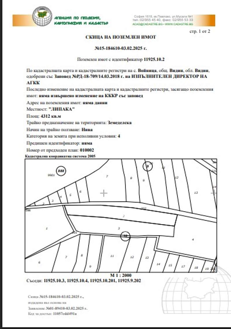 ½ ид.ч.отПоземлен имот с идентификатор11925.10.2 област Видин, община Видин, с. Войница, м. ЛИПАКА, вид собств. Частна, вид територия Земеделска, категория 4, НТП Нива, площ 4312 кв. м, стар номер 010002, Брой върхове:7 бр.при съседи на имота по скица: 11925.9.202, 11925.10.3, 11925.10.4, 11925.10.201.