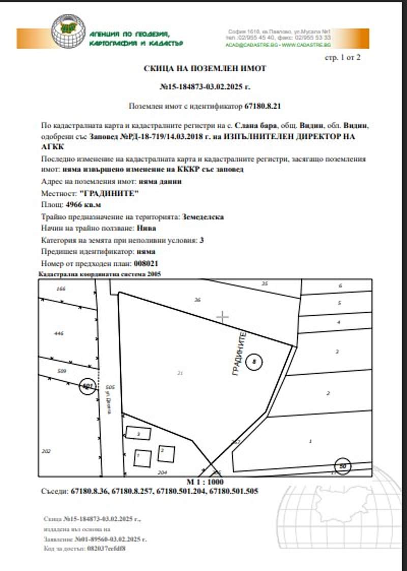 ½ ид.ч. от Поземлен имот с идентификатор 67180.8.21 област Видин, община Видин, с.Слана Барам. ГРАДИНИТЕ, вид собств. Частна, вид територия Земеделска, категория 3, НТП Нива, площ 4966 кв. м, стар номер 008021, Брой върхове: 7 бр.при съседи на имота по скица: 67180.8.36, 67180.8.257, 67180.501.204, 67180.501.505.