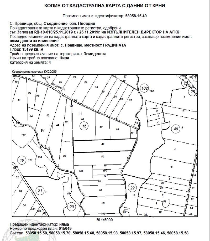 ИД № 20238250400573 -½ (една втора) идеална част от 441/720 ид.ч. /четиристотин четиридесет и една върху седемстотин и двадесет идеални части/ от Поземлен имот с идентификатор 58058.15.49 (пет, осем, нула, пет, осем, точка, едно, пет, точка, четири, девет) по кадастралната карта и кадастралните регистри на с. Правище, община Съединение, област Пловдив, одобрени със Заповед за одобрение на КККР № РД-18-818/25.11.2019 г. на ИЗПЪЛНИТЕЛЕН ДИРЕКТОР НА АГКК, с адрес: с. Правище, община Съединение, м. ГРАДИНАТА, вид територия Земеделска, категория 4 (четвърта), Начин на трайно ползване: Нива, с площ 15199 кв.м (петнадесет хиляди сто деветдесет и девет квадратни метра), стар номер 015049, при граници 58058.15.50; 58058.15.70; 58058.15.48; 58058.15.98; 58058.15.97; 58058.15.46; 58058.15.58, с описание съгласно нотариален акт НИВА с площ от 15.201 дка /петнадесет декара и двеста и един квадратни метра/, от които 11.024 /единадесет декара и двадесет и четири квадратни метра/ четвърта категория и 4.177 /четири декара и сто седемдесет и седем квадратни метра/ трета категория на земята при неполивни условия, съставляваща имот № 015049 /нула, едно, пет, нула, четири, девет/, находящ се в местността "ГРАДИНАТА", в землището на с. Правище с ЕКАТТЕ 58058 /пет, осем, нула, пет, осем/, общ. Съединение, обл. Пловдив, при граници и съседи: имот № 015097 - Нива на Александър Стойчев Тютюнджиев, имот № 015098 - Нива на Иван Стойчев Тютюнджийски, имот № 015048 - Нива на насл, на Стояна Дочева Дочева и др., имот № 015070 - Полски път на Община "Съединение", имот № 015050 - Нива на насл, на Запрян Александров Лапков, имот № 015058 - Напоител. Канал на Община Съединие - Канали и имот № 015046 - Овощнаградинана Стойна Илиева Стоянова. Началната цена, от която ще започне публичната продан е в размерна4761,15 € (четири хиляди седемстотин шестдесет и едно евро и петнадесет евроцента), съставляваща 80 % от стойността на имота, съгласно чл. 485 от ГПК.