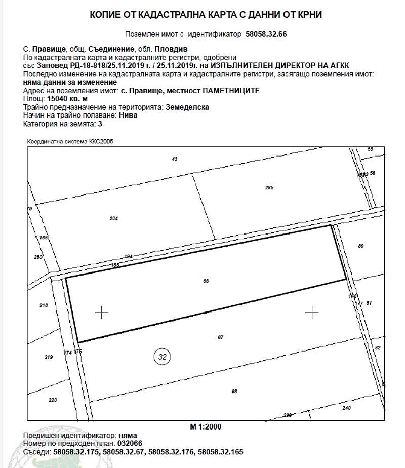 ИД № 20238250400573 -½ (една втора) идеална част от19/30 ид. ч./деветнадесет тридесети идеални части/ от Поземлен имот с идентификатор 58058.32.66 (пет, осем, нула, пет, осем, точка, три, две, точка, шест, шест) по кадастралната карта и кадастралните регистри на с. Правище, община Съединение, област Пловдив, одобрени със Заповед за одобрение на КККР № РД-18-818/25.11.2019 г. на ИЗПЪЛНИТЕЛЕН ДИРЕКТОР НА АГКК, с адрес: с. Правище, община Съединение, м. ПАМЕТНИЦИТЕ, вид територия Земеделска, категория 3 (трета), Начин на трайно ползване: Нива, с площ 15040 кв.м (петнадесет хиляди и четиридесет квадратни метра), стар номер 032066, при граници 58058.32.175; 58058.32.67; 58058.32.176; 58058.32.165, с описание по нотариален акт НИВА с площ от 15.041 дка /петнадесет декара и четиридесет и един квадратни метра/, трета категория на земята при неполивни условия, съставляваща имот № 032066 /нула, три, две, нула, шест, шест/, находящ се в местността "ПАМЕТНИЦИТЕ", с. Правище с ЕКАТТЕ 58058 /пет, осем, нула, пет, осем/, общ. Съединение, обл. Пловдив, при граници и съседи: имот № 032175 - Полски път на Община "Съединение", имот № 032067 - Нива на Илинка Христова Празова, имот № 032176 - Напоител. Канал на Община "Съединение" - Канали и имот № 032165 - Напоител. Канал на Община "Съединение" – Канали. Началната цена, от която ще започне публичната продан е в размер на 4 871,59 € (четири хиляди осемстотин седемдесет и едно евро и петдесет и девет евроцента), съставляваща 80 % от стойността на имота, съгласно чл. 485 от ГПК.