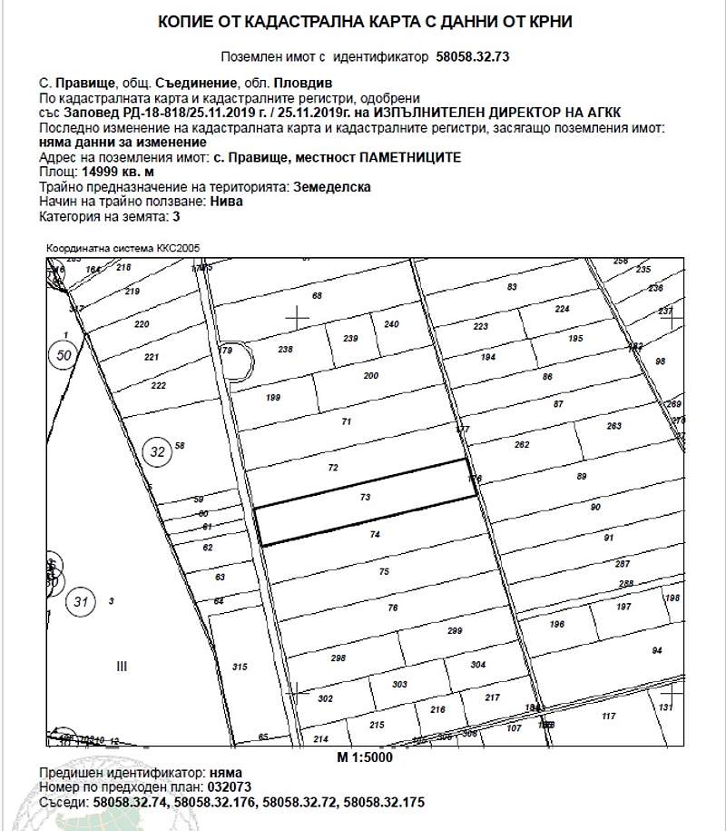 ИД № 20238250400573 -½ (една втора) идеална част отПоземлен имот с идентификатор 58058.32.73 (пет, осем, нула, пет, осем, точка, три, две, точка, седем, три) по кадастралната карта и кадастралните регистри на с. Правище, община Съединение, област Пловдив, одобрени със Заповед за одобрение на КККР № РД-18-818/25.11.2019 г. на ИЗПЪЛНИТЕЛЕН ДИРЕКТОР НА АГКК, с адрес: с. Правище, община Съединение, м. ПАМЕТНИЦИТЕ, вид територия Земеделска, категория 3 (трета), Начин на трайно ползване: Нива, с площ 14999 кв.м (четиринадесет хиляди деветстотин деветдесет и девет квадратни метра), стар номер 032073, при граници 58058.32.74; 58058.32.176; 58058.32.72; 58058.32.175, с описание по нотариален акт НИВА с площ от 15.000 дка /петнадесет декара/, трета категория на земята при неполивни условия, съставляваща имот № 032073 /нула, три, две, нула, седем, три/, находящ се в местността "ПАМЕТНИЦИТЕ", в землището на с. Правище с ЕКАТТЕ 58058 /пет, осем, нула, пет, осем/, общ. Съединение, обл. Пловдив, при граници и съседи: имот № 032072 - Нива на Ангел Борисов Попов, имот № 032176 - Напоител. Канал на Община "Съединение" – Канали, имот № 032074 - Нива на насл, на Тото Георгиев Попов и имот № 032175 - Полски път на Община "Съединение". Началната цена, от която ще започне публичната продан е в размер на 7 669,38 € (седем хиляди шестстотин шестдесет и девет евро и тридесет и осем евроцента), съставляваща 80 % от стойността на имота, съгласно чл. 485 от ГПК.